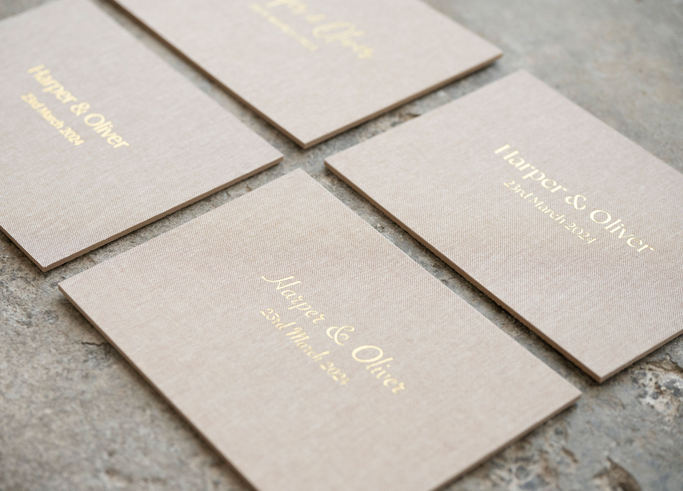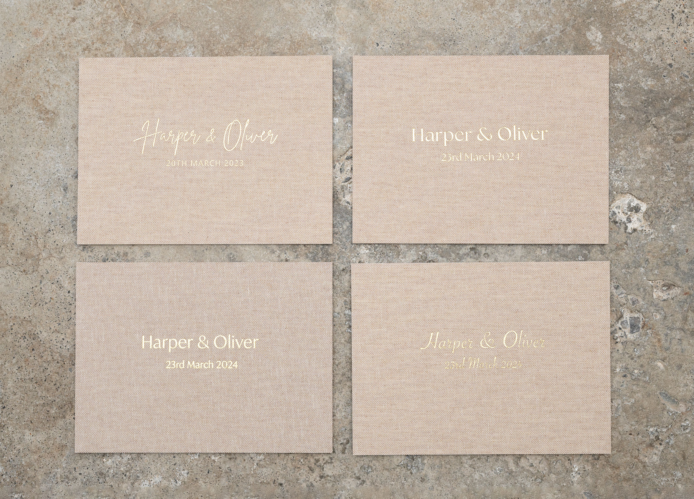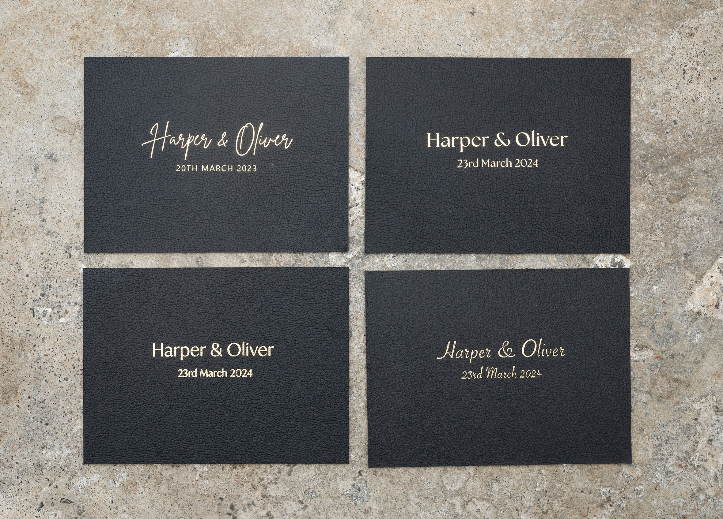 Each Font Swatch set includes 4 7x5" samples, each embossed with one of our standard fonts - Brittany, Ivy, Seasons and Savoy. Choose between a set of Black Leather swatches with gold foil, or Jute Linen swatches with gold foil.