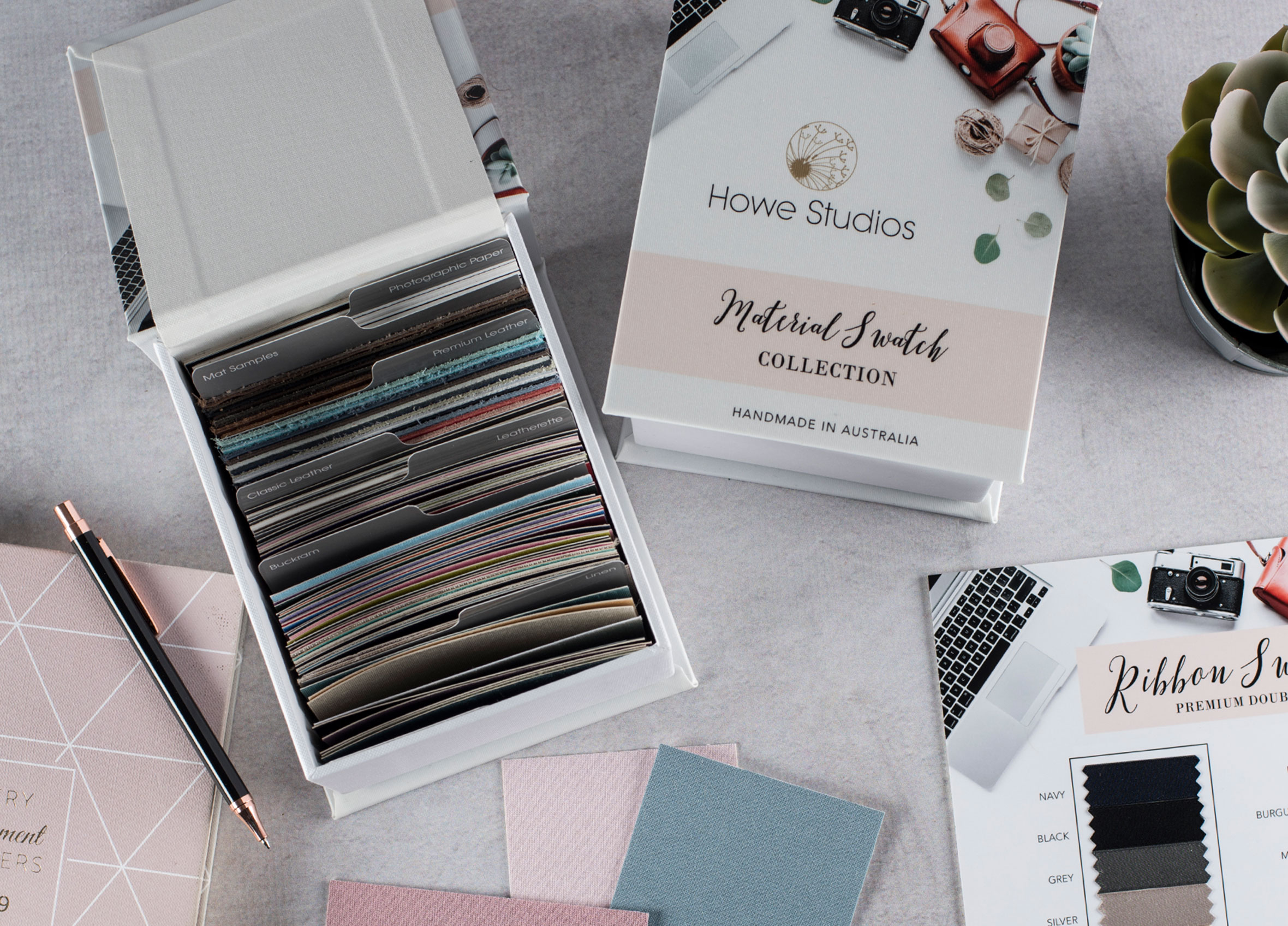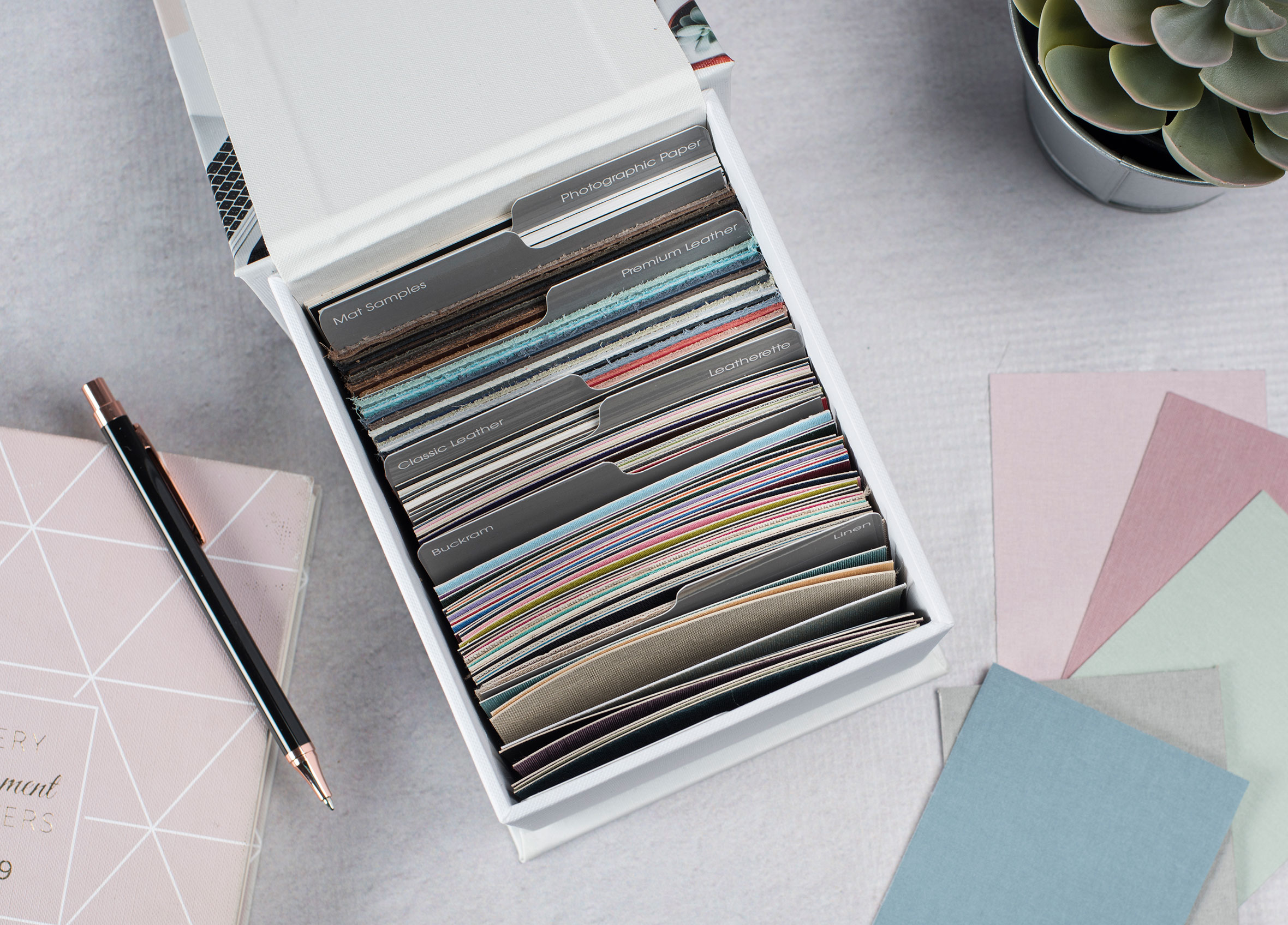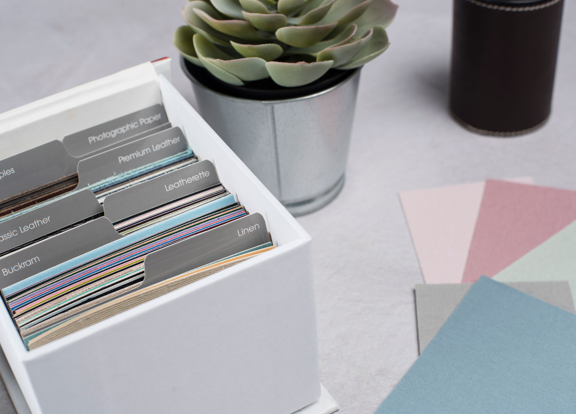 We offer sample swatches for all our album and folio covers. Swatches can be purchased as a full set in a Material Swatch Box or individually per material range (eg: Premium Leather, Classic Leather, Asahi, Linen, Velvet, Leatherette and Buckram).