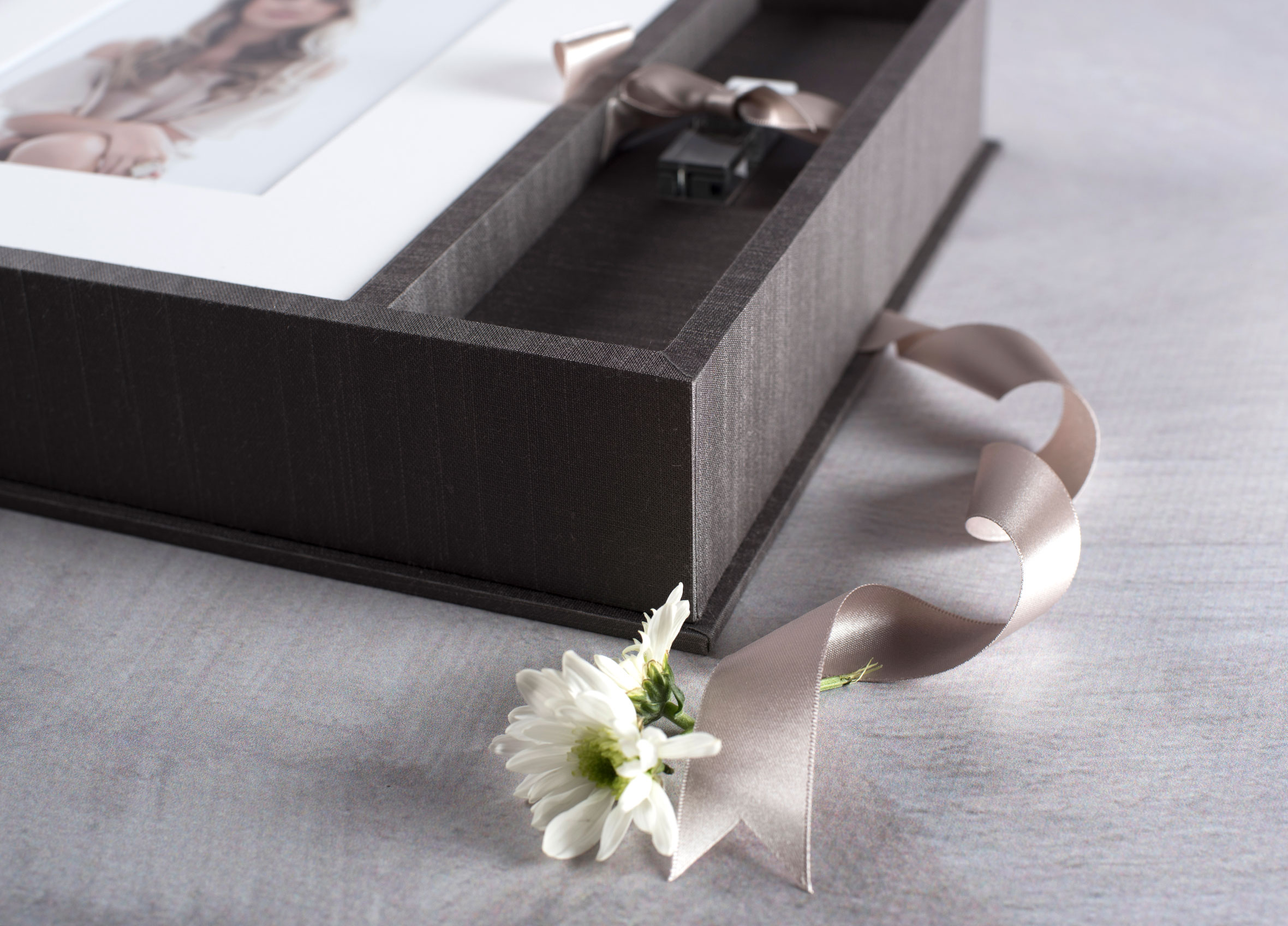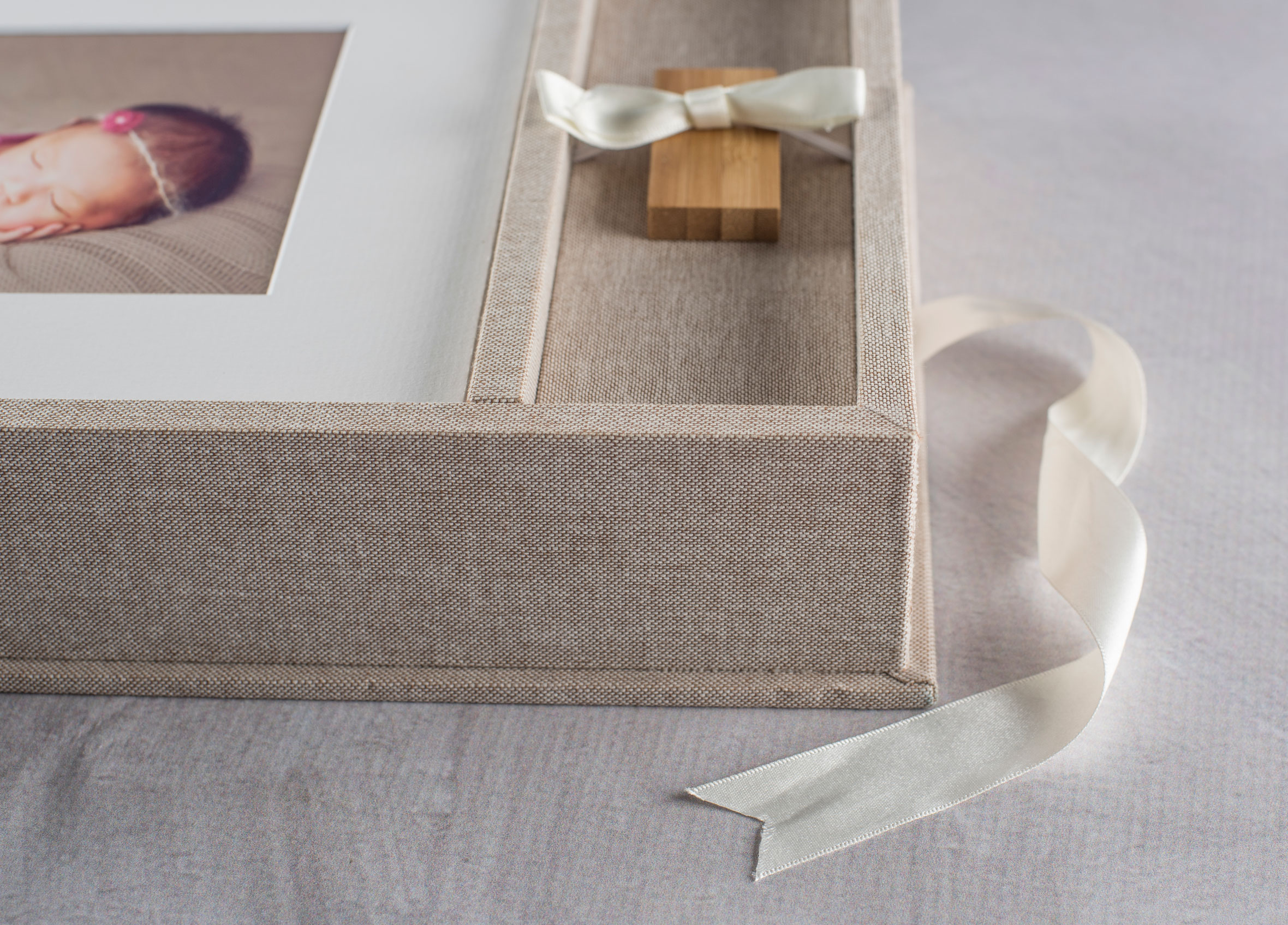 Each Folio Box includes a ribbon to lift out the Frame Mounts. You can also add a Ribbon Tie Closure to the outside of your Folio.