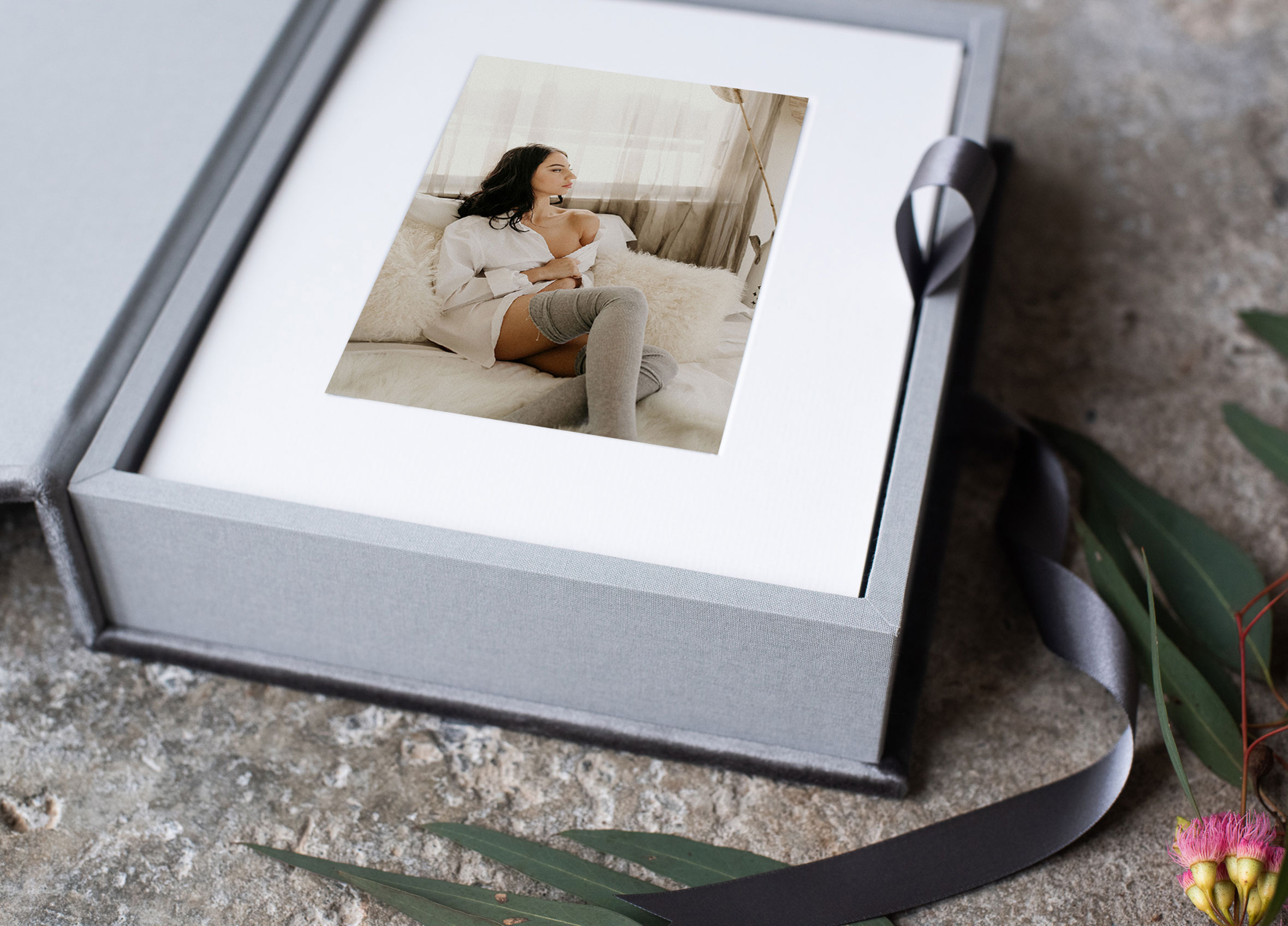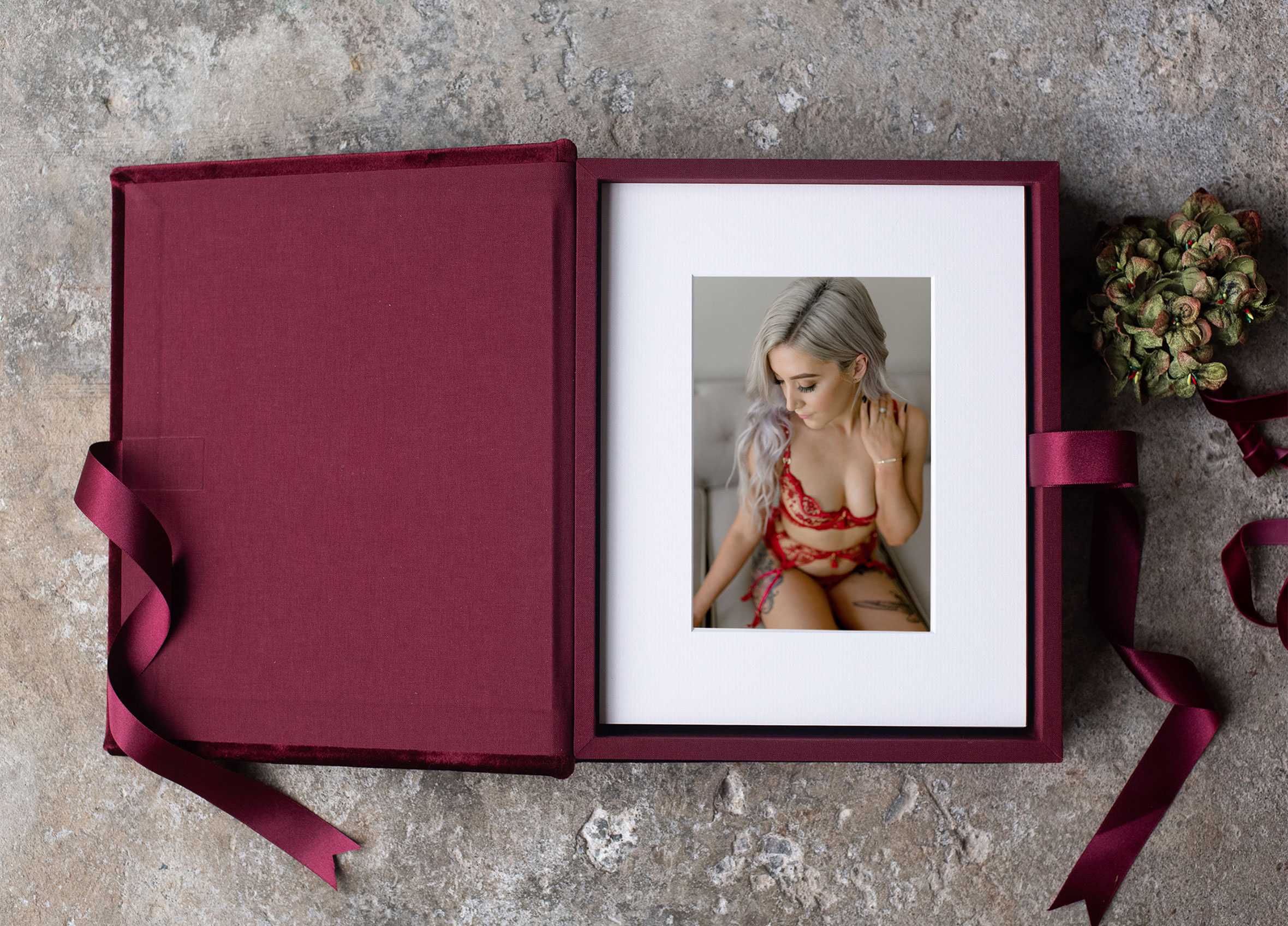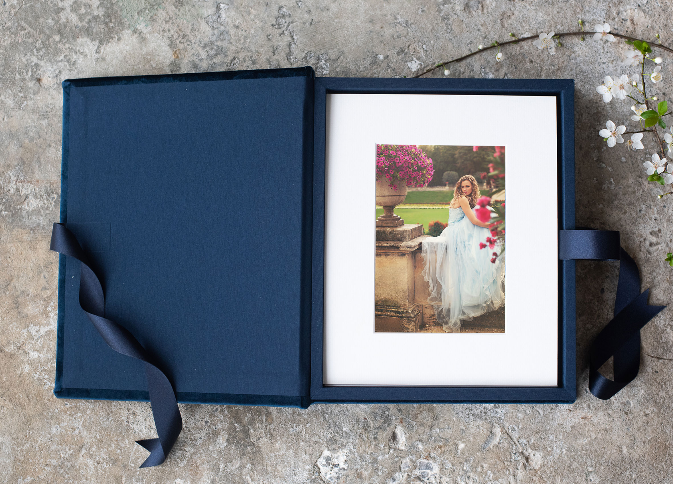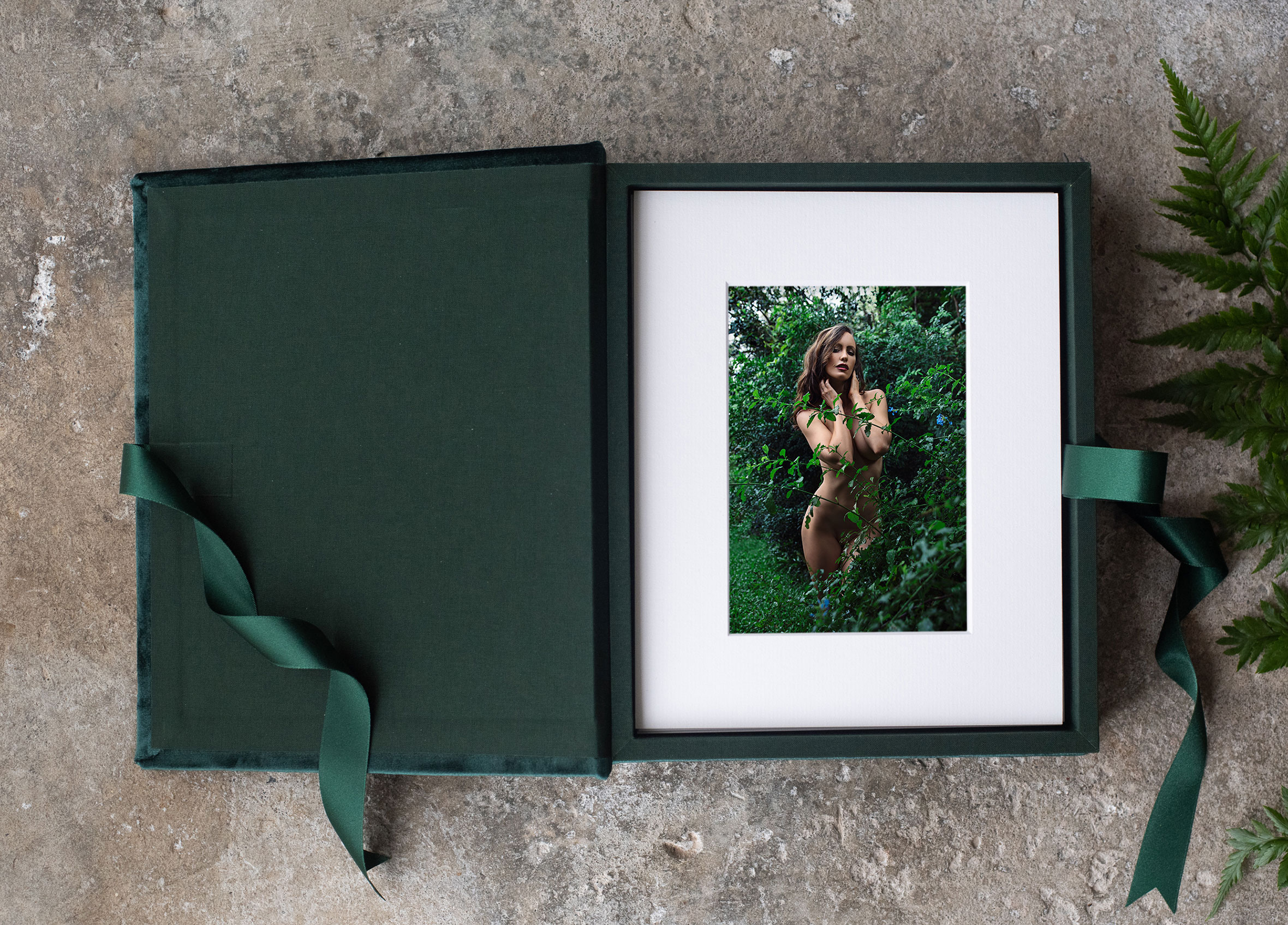 Velvet Folio Boxes are available in 5 gorgeous jewel toned colours. The exterior of the box is covered in Velvet whilst the interior is covered in a co-ordinating Linen cloth. Each box includes a ribbon to lift out the Frame Mounts and an optional ribbon can be added to tied the box closed.